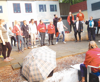 Fra scene fyrer hele koret ”Disco Tango” af, for kort efter at slå over i ”Kloden drejer” i en noget beruset version.