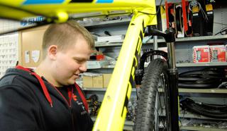 Martin arbejder rutineret med at samle en mountainbike, mens han taler. Der er travlt i værkstedet, for cykler - specielt mountainbikes - er også i år et hit hos konfirmanderne.