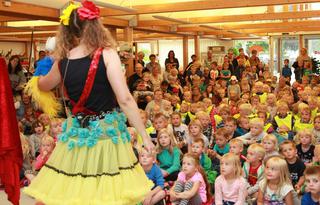 Er vejret til det, holdes det på pladsen foran biblioteket. Står vejret på regn, så rykker man indendøre. Sådan var det sidste onsdags, og der var fyldt til sidste gulvplads af spændte forventningsfulde børn.