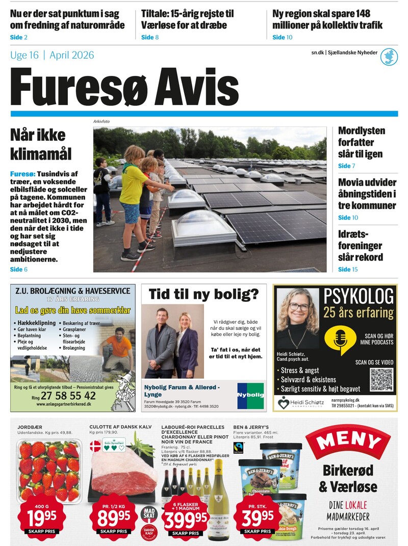 Nu er der sat punktum i sag om fredning af naturområde Tiltale: 15-årig rejste til Værløse for at dræbe Ny region skal spare 148 millioner på kollektiv trafik Side 2 Side 8 Side 10 Uge 16 April 2026 Arkivfoto Når ikke klimamål Furesø: Tusindvis af træer, en voksende elbilsflåde og solceller