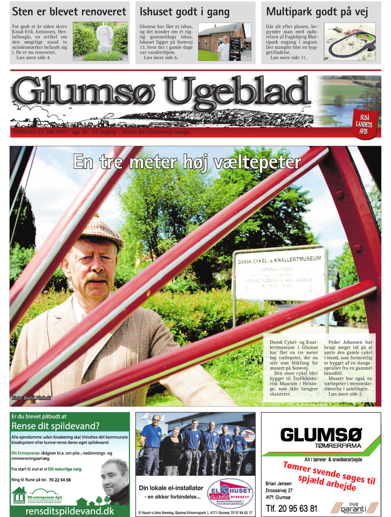 2 Susåavisen TIRSDAG D. 11. JULI 2017 Megastor væltepeter er flyttet til Glumsø GLUMSØ: Dansk Cykel- og Knallertmuseum har fået en tre meter høj væltepeter, der nu står som vartegn for museet. En tre meter høj væltepeter rykkede onsdag den 5. juli ind på Dansk Cykel- og Knallertmuseum på Sorøvej