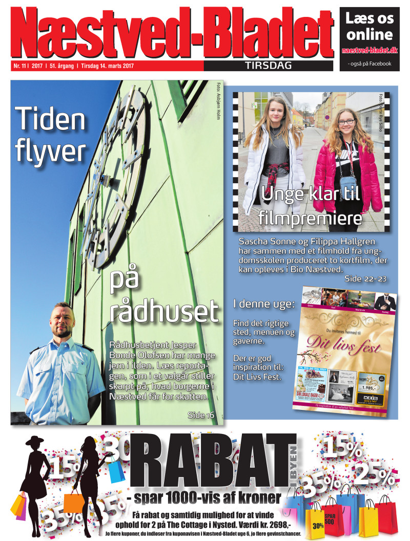 Læs os online naestved-bladet.dk TIRSDAG Nr. 11 2017 51. årgang Tirsdag 14. marts 2017 - også på Facebook Tiden flyver Unge klar til filmpremiere Sascha Sonne og Filippa Hallgren på rådhuset Rådhusbetjent Jesper Bonde Olofsen har mange jern i ilden. Læs reporta- gen, som i et valgår stiller skarp