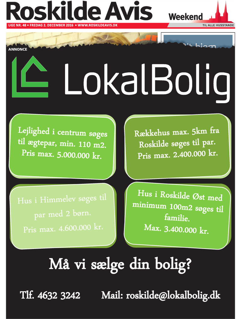 Bolig Uge nr. 48 Fredag 2. december 2016 www.roskildeavis.dk Dit hjem ANNONCE Må vi sælge din bolig? Tlf. 4632 3242 Mail: roskildelokalbolig.dk