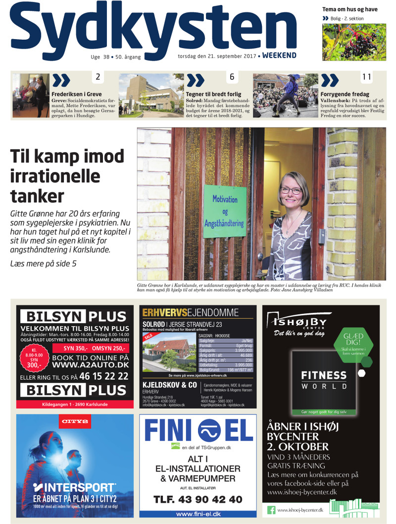 21. SEPTEMBER 2017 / WEEKEND Sydkysten 5 Gitte Grønne er gift med Karsten Grønne og har tre børn. Hun bor i Karlslunde, hvor hun også har åbnet sin nye klinik. Foto: Jane Aunsbjerg Villadsen - Man skal afsløre de irrationelle tanker Gitte Grønne har arbejdet med angst i mange år og har nu åbnet si