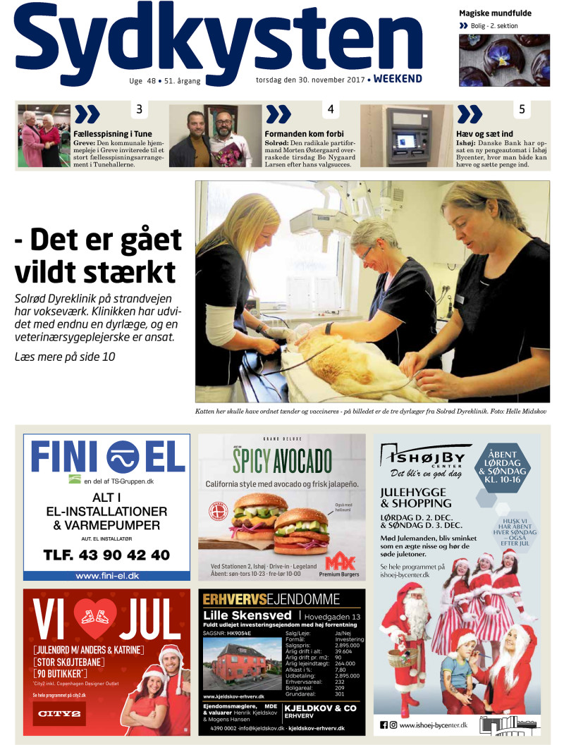 10 Sydkysten WEEKEND / 30. NOVEMBER 2017 Solrød Dyreklinik har vokseværk Dyreklinikken har udvidet med endnu en dyrlæge, og en veterinærsygeplejerske er ansat Solrød: Solrød Dyreklinik på Solrød Strandvej har vokseværk. Klinikken er på medarbejdersiden udvidet med en dyrlæge og en veterinærsygeple