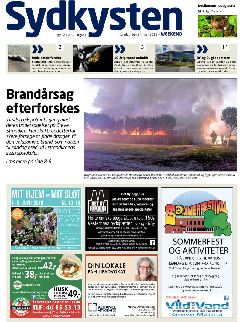 8 Sydkysten WEEKEND / 24. MAJ 2018 Strandkro stod i flammer Natten til søndag rykkede brandvæsnet ud til en kraftig brand i selskabslokalerne på Greve Strandkro. Samme selskabslokaler blev i weekenden forinden udsat for forsøg på brandstiftelse Greve: Tirsdag startede politiets brandefterforskere