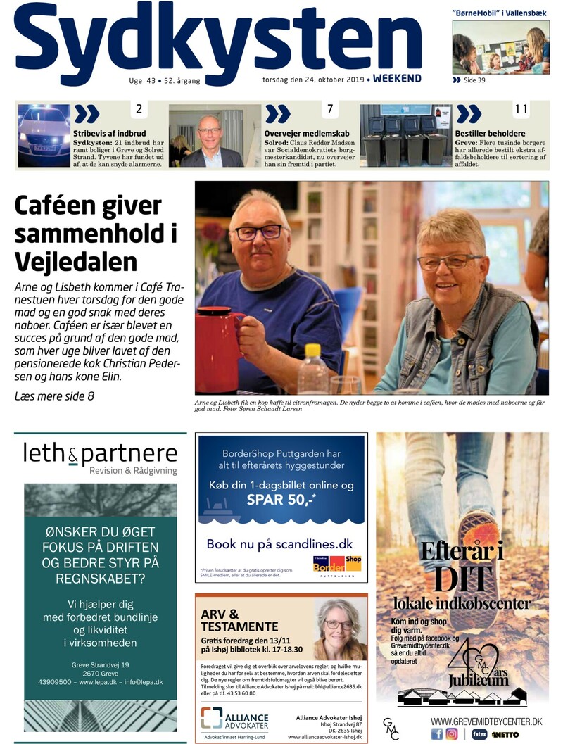2 Sydkysten WEEKEND / 24. OKTOBER 2019 WEEKEND - en del af Fyldt med lokale impulser Greve Strandvej 24, 2670 Greve Tlf. 4390 4422 Man.-fre.: 9.00-16.00 UDGIVELSESDAG TORSDAG / FREDAG TRYK & SATS Dagbladet Ringsted A/S DISTRIBUTION FK Distribution Ved udeblivelse af Sydkysten kontakt os venl