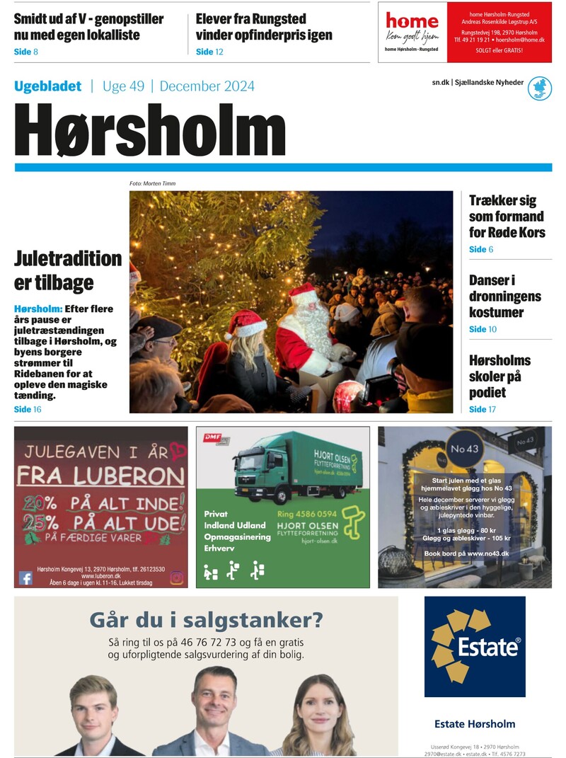 Smidt ud af V - genopstiller nu med egen lokalliste Elever fra Rungsted vinder opfinderpris igen Side 8 Side 12 Ugebladet Uge 49 December 2024 Foto: Morten Timm Trækker sig som formand for Røde Kors Juletradition er tilbage Hørsholm: Efter flere års pause er juletræstændingen tilbage i Hørs