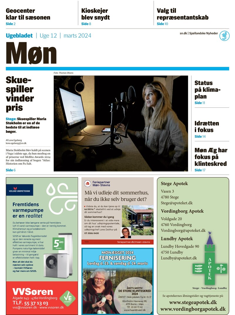 Geocenter klar til sæsonen Kioskejer blev snydt Valg til repræsentantskab Side 2 Side 8 Side 10 Ugebladet Uge 12 marts 2024 Foto: Thomas Olsens Skuespiller vinder pris Stege: Skuespiller Maria Stokholm er en af de bedste til at indlæse bøger. Status på klimaplan Side 11 Idrætten i fokus