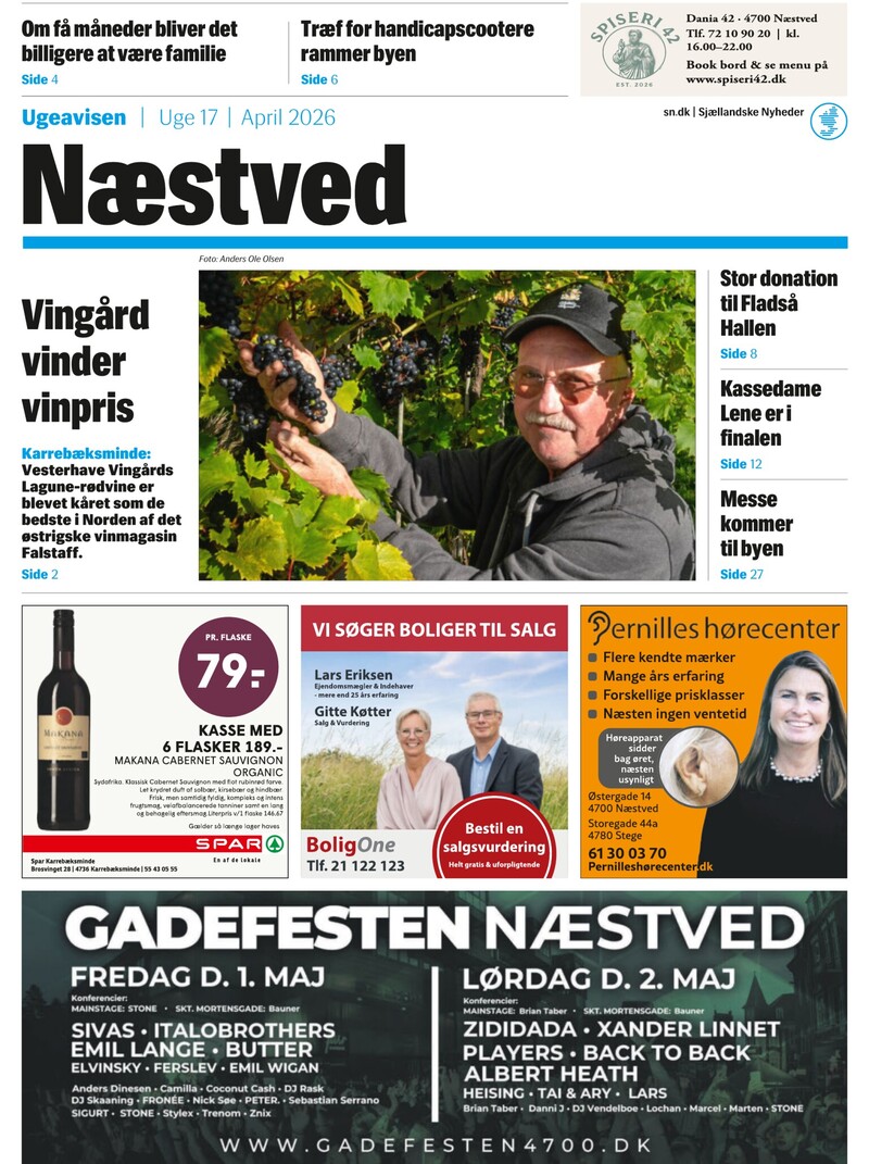 Om få måneder bliver det billigere at være familie Træf for handicapscootere rammer byen Side 4 Side 6 Ugeavisen Uge 17 April 2026 Foto: Anders Ole Olsen Vingård vinder vinpris Karrebæksminde: Vesterhave Vingårds Lagune-rødvine er blevet kåret som de bedste i Norden af det østrigske vinmagasin Falstaff. Side 2 Stor donation til Fladså Hallen Side 8 Kassedame Lene er i finalen Side 12 Messe kommer til byen Side 27