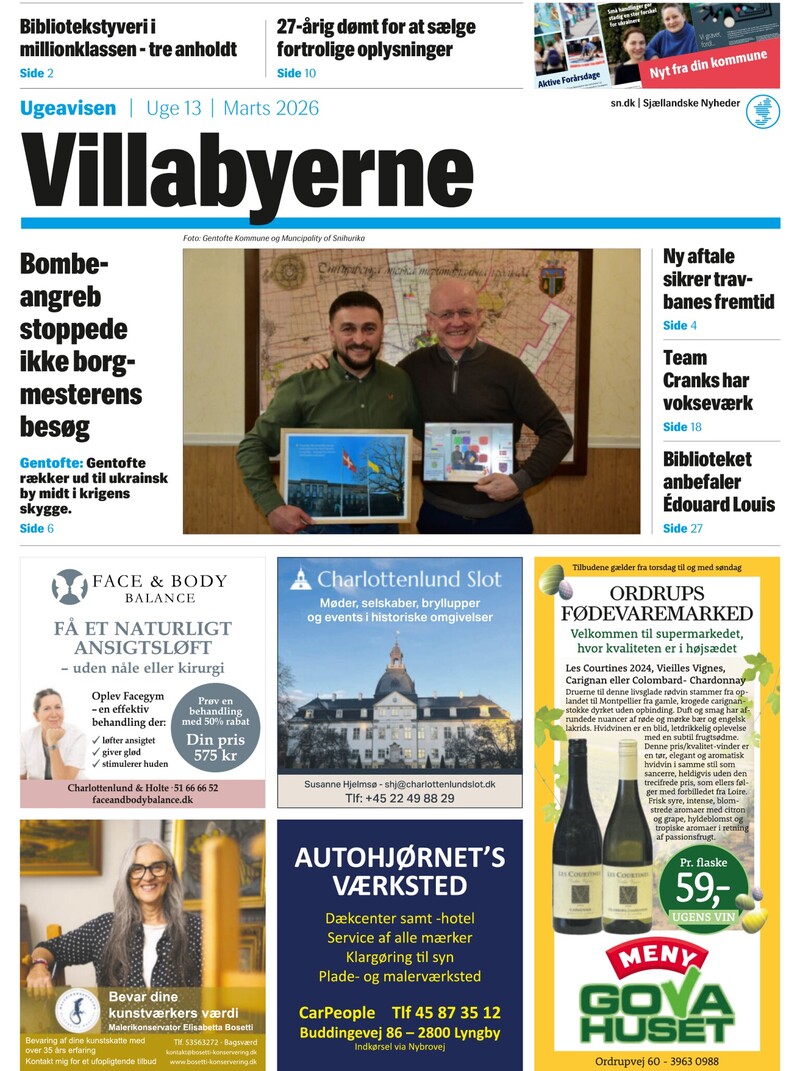 Bibliotekstyveri i millionklassen - tre anholdt 27-årig dømt for at sælge fortrolige oplysninger Side 2 Side 10 Ugeavisen Uge 13 Marts 2026 Foto: Gentofte Kommune og Muncipality of Snihurika Bombeangreb stoppede ikke borgmesterens besøg Ny aftale sikrer travbanes fremtid Gentofte: Gentofte